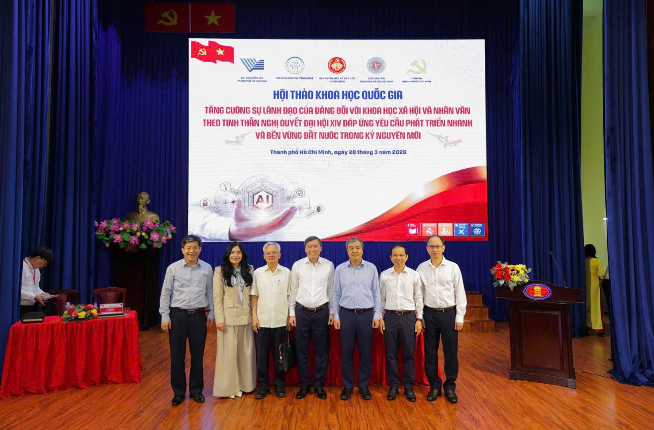 Sáng ngày 28/3/2026, tại Hội trường Văn khoa, Trường Đại học Khoa học Xã hội và Nhân văn (ĐHQG-HCM) đã diễn ra Hội thảo khoa học quốc gia với chủ đề: “Tăng cường sự lãnh đạo của Đảng đối với khoa học xã hội và nhân văn theo tinh thần Nghị quyết Đại hội XIV đáp ứng yêu cầu phát triển nhanh và bền vững đất nước trong kỷ nguyên mới”. Sự kiện do Ban Tuyên giáo và Dân vận Trung ương chủ trì, phối hợp với Viện Hàn lâm Khoa học xã hội Việt Nam, Bộ Khoa học và Công nghệ, Thành ủy Thành phố Hồ Chí Minh và Đại học Quốc gia TP. Hồ Chí Minh tổ chức.