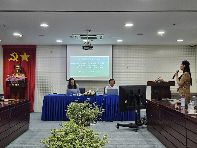 Buổi chiều, diễn ra phiên thứ 2, chủ trì có TS. Hoàng Thị Thu Huyền – Phó Viện trưởng Viện Khoa học xã hội vùng Nam Bộ, TS. Nguyễn Thị Minh Nguyệt – Giám đốc Trung tâm nghiên cứu Dân tộc và Tôn giáo, cùng với sự tham dự của lãnh đạo và toàn thể cán bộ nghiên cứu ở các trung tâm thuộc Viện. Với 7 tham luận trình bày tại phiên 2 gồm một số kết quả nghiên cứu qua hệ nhiệm vụ khoa học và công nghệ cấp Cơ sở năm 2025: 1) Các di tích mộ táng và quan hệ văn hóa vùng cận biển Đông Nam Bộ thời hậu kỳ kim khí – ThS. Đặng Ngọc Kính; 2) Đời sống kinh tế hộ gia đình người Chăm có lao động đi làm ăn xa (Nghiên cứu tại ấp La Ma, xã Vĩnh Hậu, tỉnh An Giang) – NCV. Phan Thanh Lời; 3) Quá trình chuyển biến hoạt động kinh tế ở xã An Đức, huyện Ba Tri, tỉnh Bến Tre giai đoạn 2010-2024 - ThS. Nguyễn Thị Kim Nương; 4) Tình hình ứng dụng thương mại điện tử của các doanh nghiệp dịch vụ vừa và nhỏ tại TPHCM - ThS. Nguyễn Thị Vân; 5) Thúc đẩy môi trường làm việc công bằng cho tài xế xe ôm công nghệ: Trách nhiệm xã hội của công ty nền tảng - ThS. Nguyễn Thị Minh Châu; 6) Các tiếp cận lý thuyết trong nghiên cứu hạnh phúc ở trường học - ThS. Lê Thị Mỹ; 7) Đặc điểm và nguyên nhân dẫn đến tình trạng trẻ em nhập cư ngoài nhà trường: Nghiên cứu trường hợp các lớp học tình thương, phổ cập tại TPHCM - ThS. Nguyễn Đặng Minh Thảo.