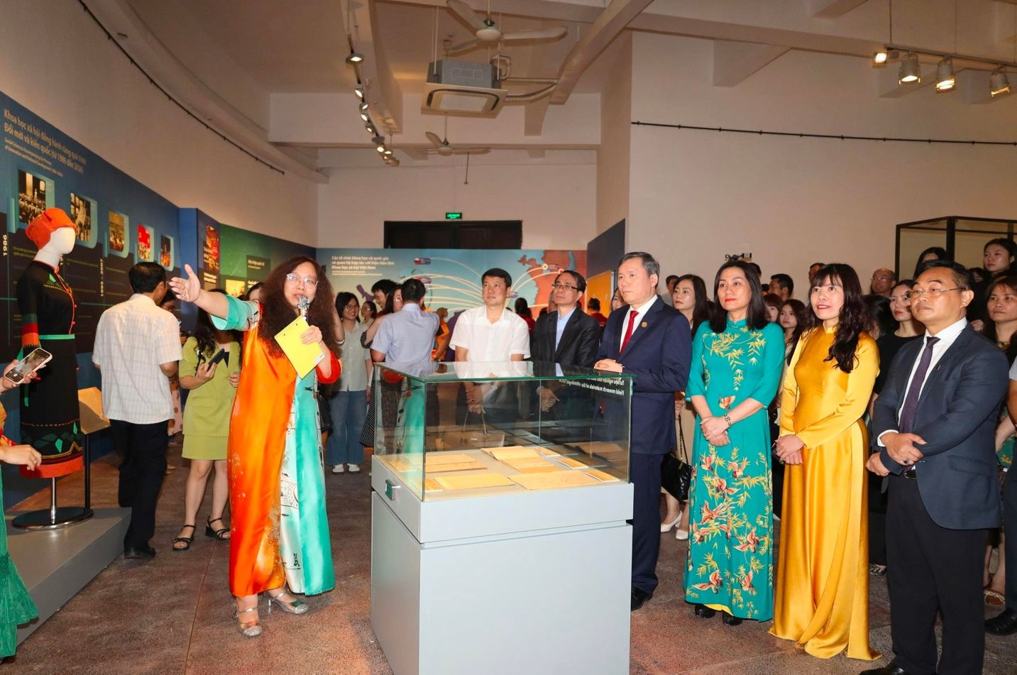 GS.TS. Lê Văn Lợi, Chủ tịch Viện Hàn lâmvà khách mời tham dự sự kiện lắng nghe thông tin chia sẻ về trưng bày từ Bảo tàng
