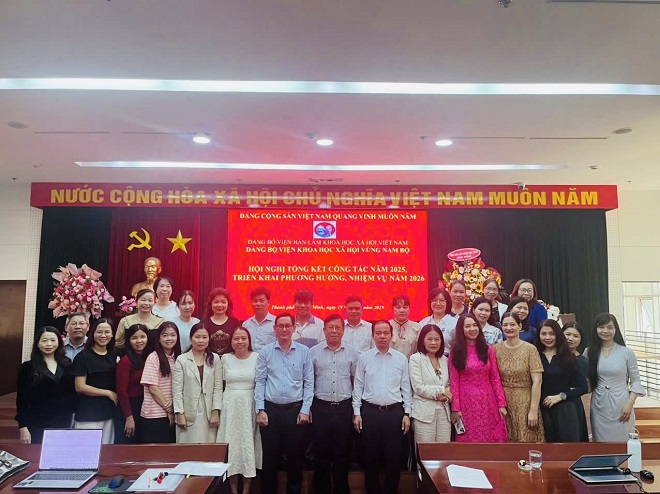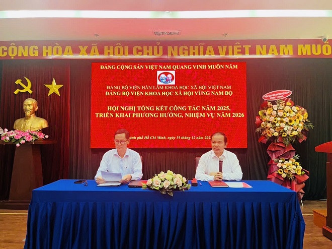 Sáng ngày 19/12/2025, Đảng bộ Viện Khoa học xã hội vùng Nam Bộ đã tổ chức Hội nghị tổng kết công tác Đảng năm 2025 và phương hướng, nhiệm vụ năm 2026. Tham dự Hội nghị có: PGS.TS. Vũ Tuấn Hưng - Bí thư Đảng ủy, Viện trưởng; TS. Nguyễn Khánh Trung Kiên - Phó Viện trưởng; cùng toàn thể đảng viên thuộc Đảng bộ Viện Khoa học xã hội vùng Nam Bộ.